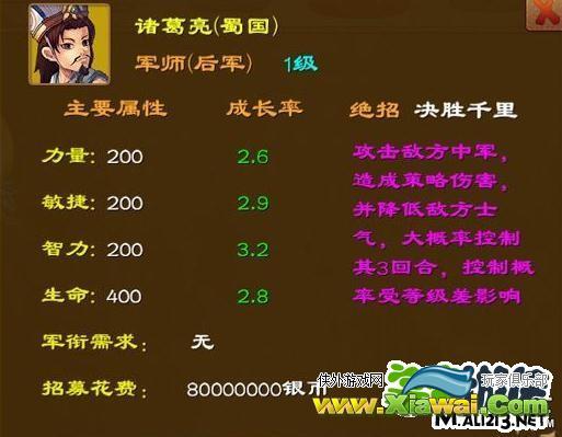 诸葛亮是《名将乱弹》游戏中的武将之一,在名将乱弹中,玩家们需要招募武将来增强自己的实力,各位名将乱弹的玩家们想要了解一下诸葛亮武将吗?下文为大家分享介绍的就是诸葛亮武将的详细介绍,请各位玩家们和我一起来了解一下吧!